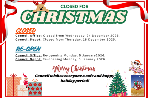 Closed: Council Office: Closed from Wednesday, 24 December 2025Council Depots: Closed from Wednesday, 17 December 2025.Reopening:Re-opening Monday, 5 January 2025